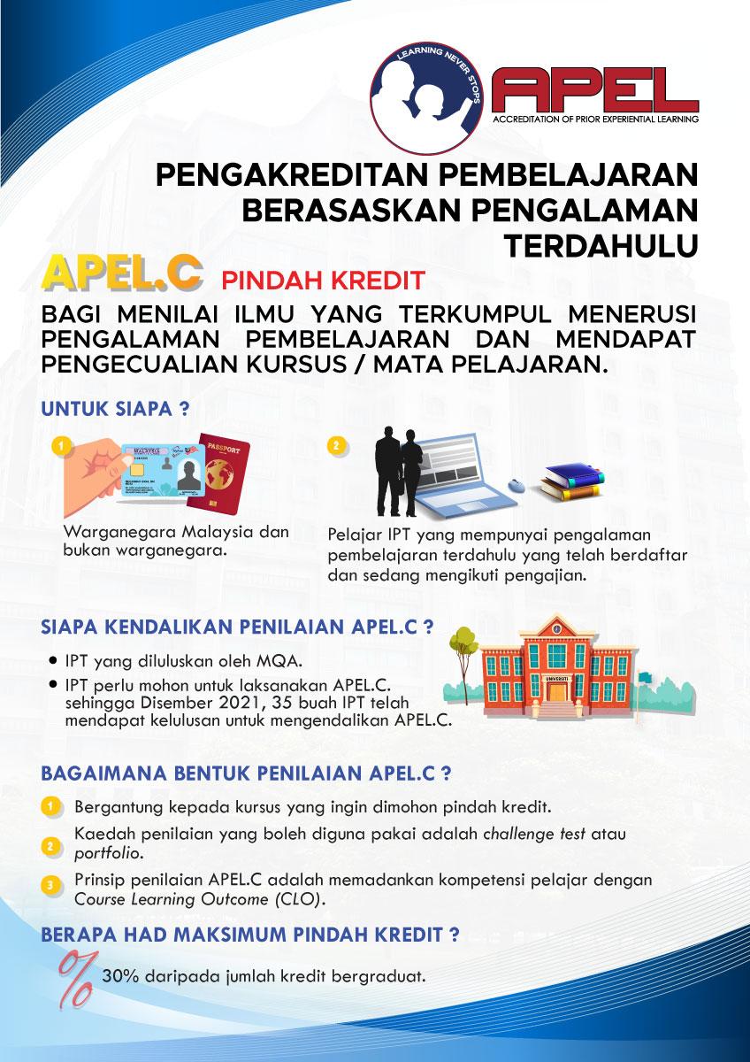 - APEL.C boleh diguna pakai bagi pelajar berdaftar menggunakan kedua-dua kemasukan konvensional dan APEL.A;
